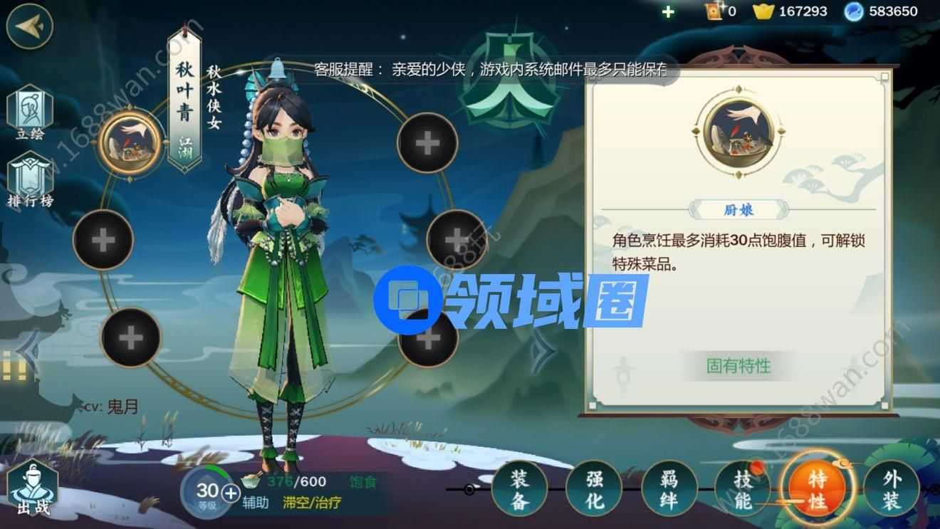 1、烹饪人物的选择,推荐使用秋叶青进行食材烹饪,秋叶青的厨娘特性是烹饪任何菜肴都只消耗30点饱食度,其他人物消耗50点饱食度,而且有些菜肴需要厨娘特性不然就算食材对也会烹饪出神仙菜肴(秋叶青只要通关主线剧情,人手一个)