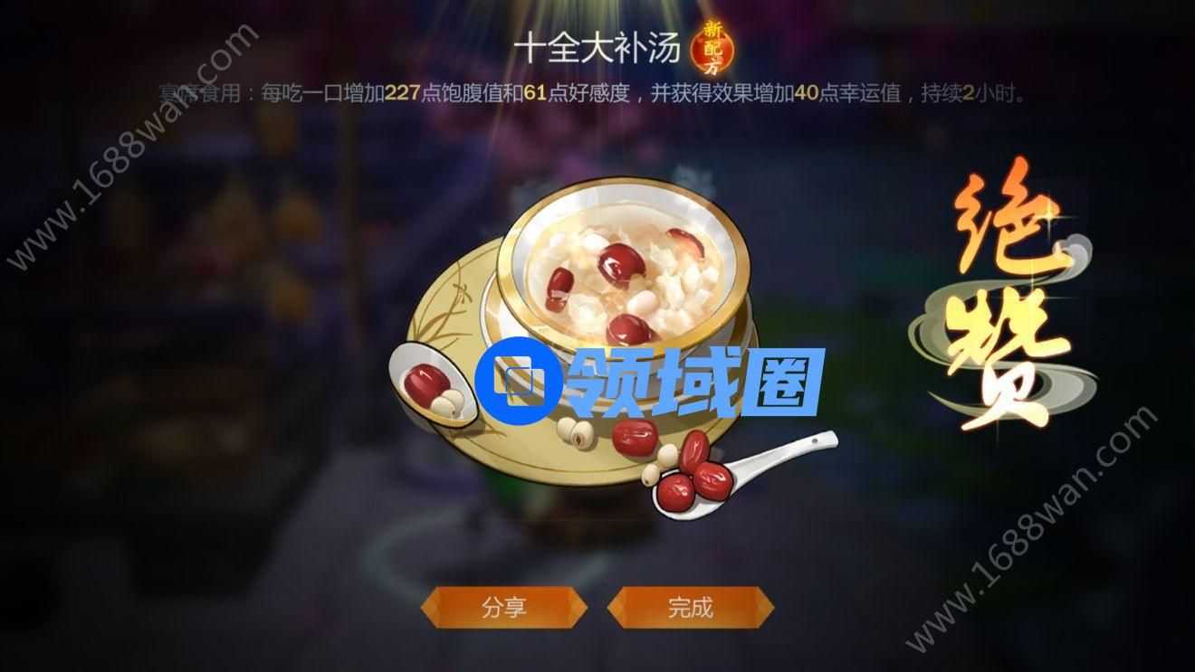 而如果大家有好感度需求或者属性加成需求就可以选择月桂金丝羹这类菜肴,它不仅增加好感度还提升了3%的全属性,至于十全大补汤则是家里有矿的玩家的选择了,一般玩家消费不起~采集半天材料才够煮一锅,属实奢侈~