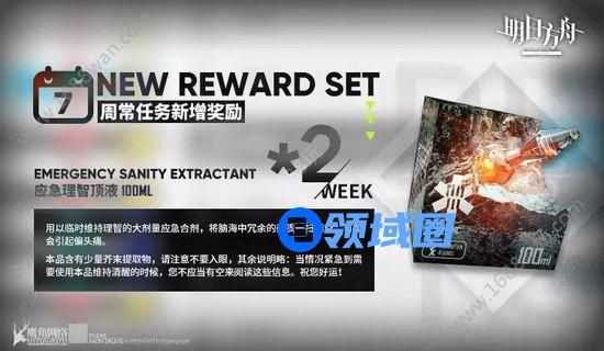 改动生效后,当您完成周常任务时,可以获得2瓶【应急理智顶液】(单瓶可恢复100理智,时效规则详见图3)