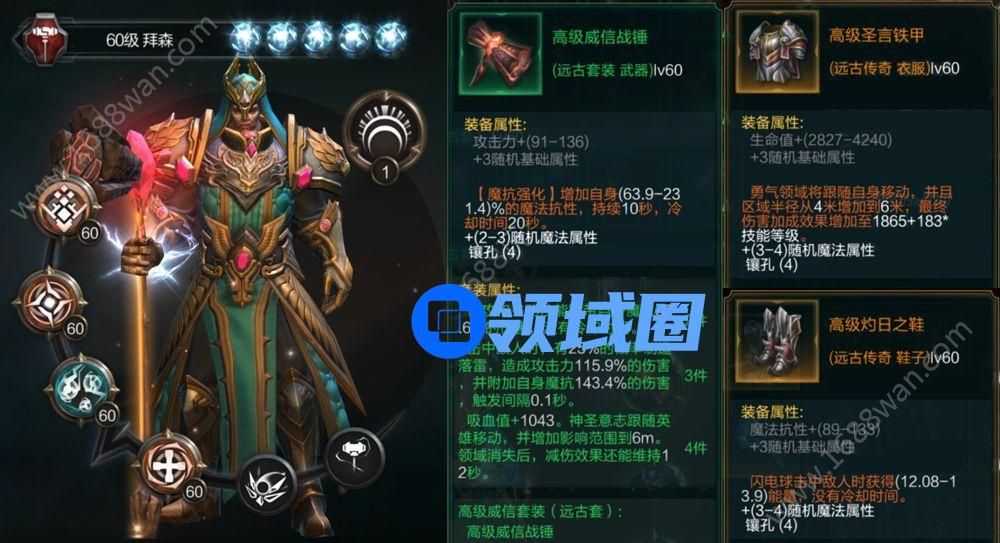 在装备上推荐通用的高级威信套,既可以搭配天赋走魔抗反伤,也能制造额外伤害,增加吸血的同时还提升【神圣意志】(友方伤害减免并伤害敌人)的效果。同时搭配高级圣言铁甲,扩大【勇气领域】的范围。
