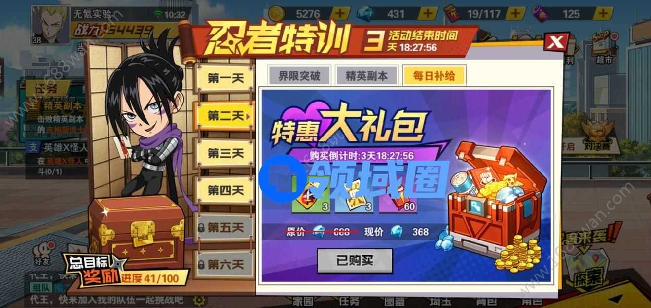 第二天的修炼依旧是完成日常任务。体力购买到250钻石60体,依然购买忍者特训当日礼包,竞技场八次打完。第二天的怪人X英雄应该可以可刷到七层甚至往上(还是五层和六层不用助战,召唤小弟的关卡只会召唤五波,助战留着高层再用),依旧不购买强者招募(十连的心情要忍住呀!),所有在位角色星级突破到当前极限。第二天达到30级时一定购买30级等级礼包(328钻石礼包)。然后会剩下10精英卷与9强者卷左右,各抽一次十连(每日血统鉴定_(:з」∠)_)。当天依旧领取三次免费体力,琦玉记忆抽取2-1和2-2。