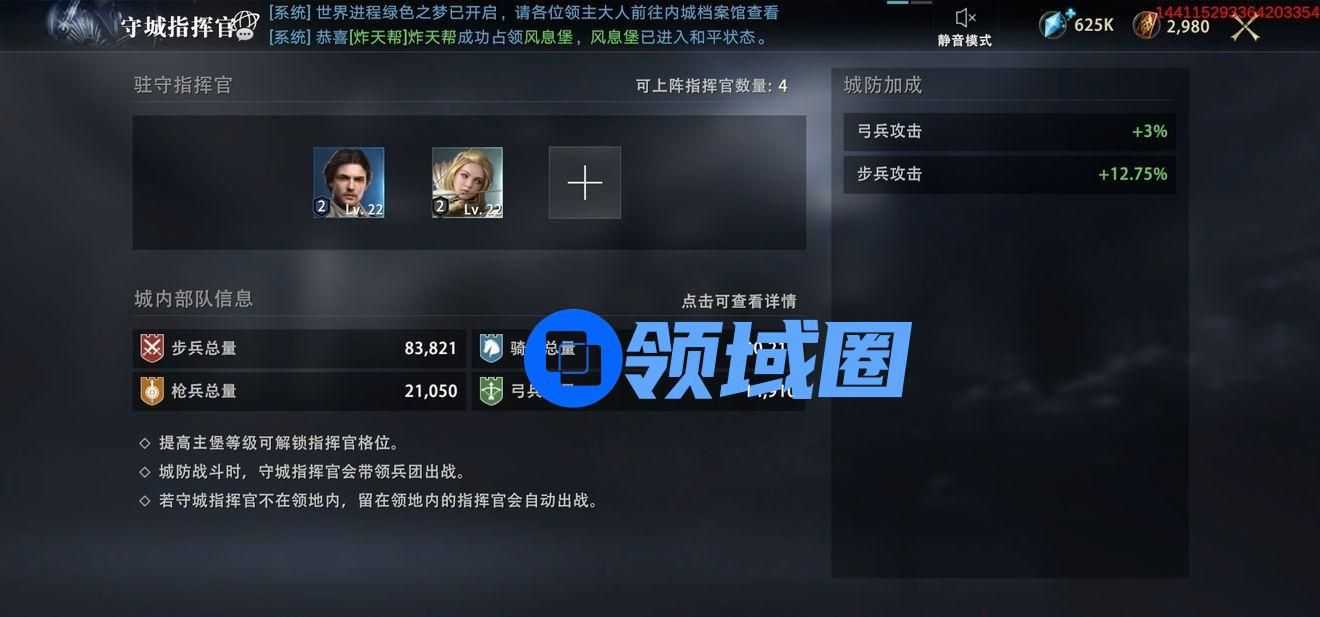 驻守指挥官格位总共有3个,提升主堡等级可解锁指挥官格位;城防战斗时,守城指挥官会带领兵团出战;若守城指挥官不在领地内,留在领地内的指挥官会自动出战。