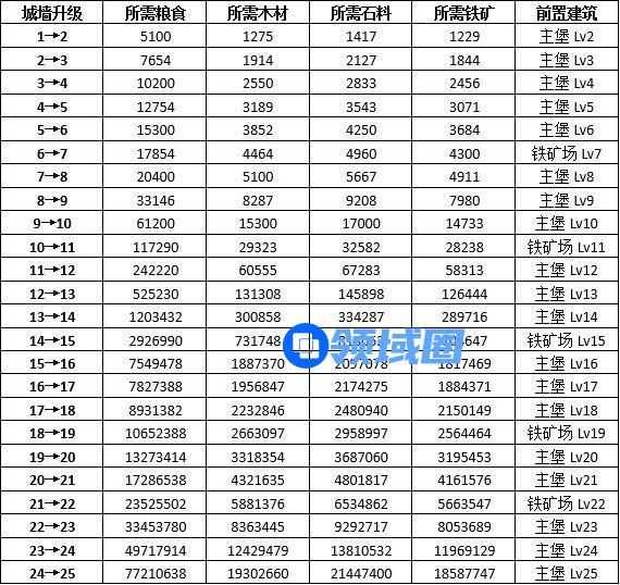 下面带来城墙升级条件一览: