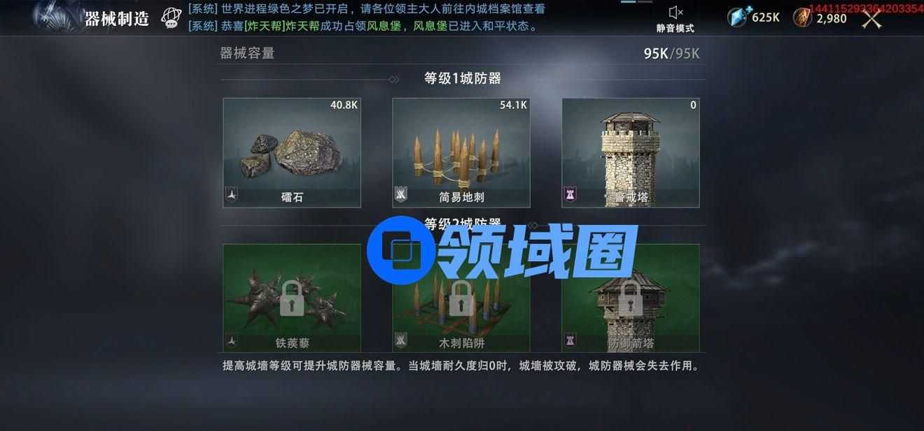 城防器分有多个级别,通过在学士塔研究器械可以解锁更高级别的城防器。城防器械容量有限,升级城墙可获得更大的器械容量。