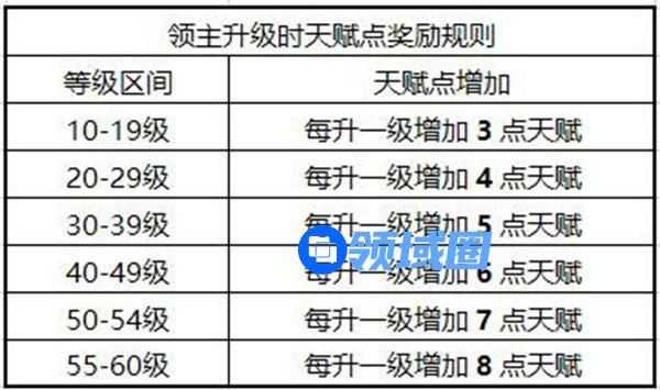 领主在学习天赋时,需要消耗一定的天赋点。天赋点是通过领主升级获得。领主等级达到10级时,可获得17点天赋。60级满级时可获得278点天赋。天赋点奖励规则如下: