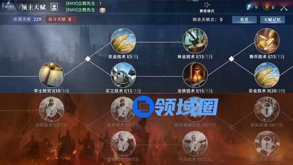 在天赋界面,领主可以看到发展天赋和战斗天赋两个分支,右上角则是重置、天赋记忆按钮。
