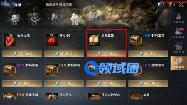 天赋重置时需要消耗对应的天赋重置道具,该道具商城中有售卖,售价100钻石/个。