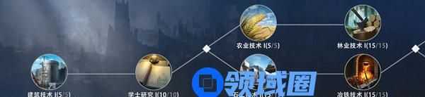 发展天赋:发展天赋是以建筑技术为起点,并向后延伸到学士研究、农业技术、林业技术、冶铁铸币等天赋。学习不同的发展天赋,可增加资源产量、加速研究速度,加快领地发展。