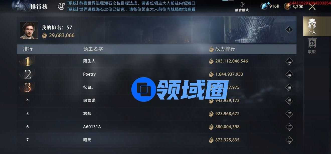 个人排行榜显示国境内前百大顶尖领主的排名,其分为[战力排行]和[消灭敌军兵量排行]两个个人排行榜,从[战力排行]入口进入后,将查看到国境内战力排行前一百名的领主;从[消灭敌军兵量排行]入口进入后,将查看到国境内消灭敌军兵量排行前一百名的领主。