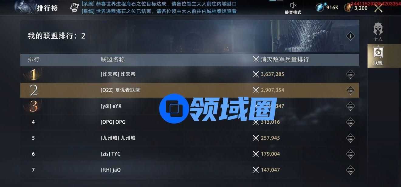 世界排行榜显示所有王国前百名顶尖玩家与联盟,同样也有[战力排行]与[消灭敌军兵量排行]两个分排行。