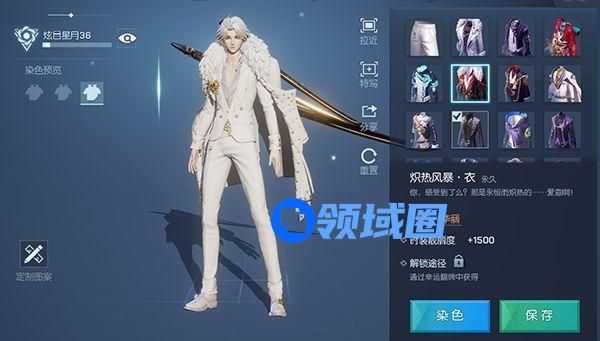 当然啦,如果你看上了外装的款式,但是颜色不喜欢,怎么办?没关系。在颜色预览这一块,每件外装都有1-3种颜色可以选择。我们选择了这件炽热风暴大衣服,就有黑色、蓝色、白色三种颜色可以选。我个人觉得白色的超级棒,你觉得呢?
