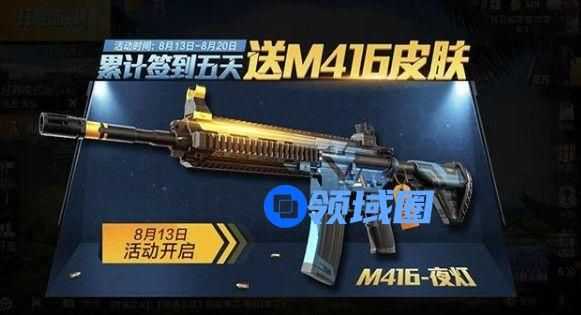 在活动期间,累计签到五天就可以获得M416皮肤,活动开始时间是8月13号到8月20号,持续时间是8天。也就是说我们是可以漏签几天的,所以这皮肤是非常容易得到的,只要上线签到就可以。