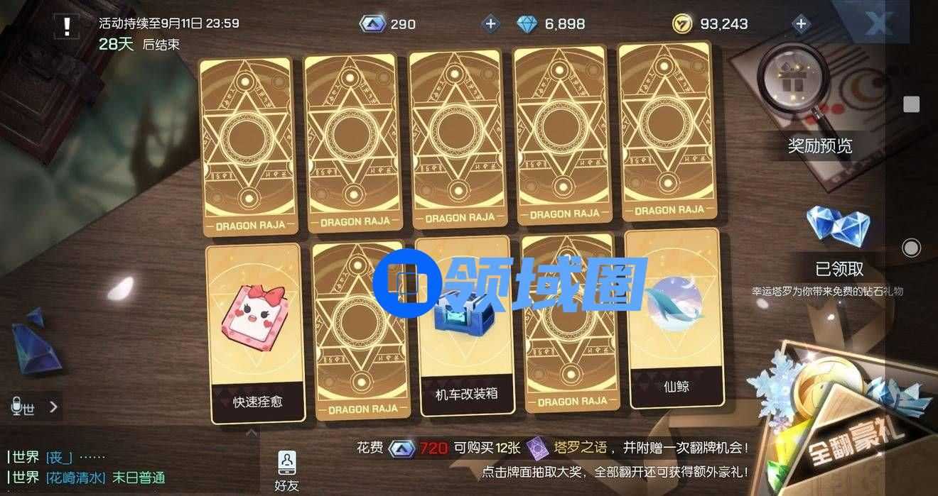 奖励总计有十种,涵盖头像框、时装、以及各种强化素材等等,而全部翻完需要总计消耗10次机会。10次所需的塔罗之语的数量分别为1、3、8、12、18、28、38、48、58、88,总计折算为18120点券。