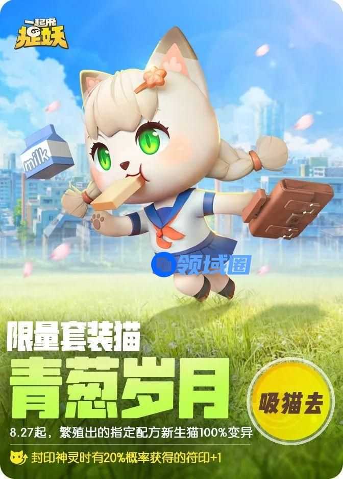 专属猫迎来全新限量套装【青葱岁月】。繁殖出的指定配方新生猫100%变异!本次套装猫【青葱岁月】限量20827只,各位吸猫的御灵师请抓紧机会。