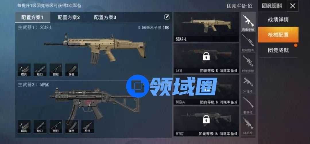 戳一下右侧的枪械配置页签,大家可以在这里更换武器,装配自己喜欢的配件。各位特种兵需要通过游玩团队竞技并解锁团竞成就,从而提升团竞等级,解锁