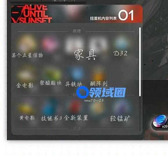 目前官方只公布了第一个扭蛋机的奖励,某些列文虎克玩家已经看出来了,典藏的奖励从左到右分别是锡兰的信物,第二个应该是黑曜石节门票,也就是刷活动关卡的通行证,第三第四是家具,然后是D32钢,高级作战记录,聚酸酯块,异铁块,酮阵列。