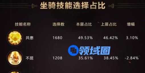 坐骑技能选择占比,共患占比49.53%强势霸榜,与上届武神坛相比还增长了3.10%。共患效果人宠分摊伤害,大幅度提升了人物与宠物的站场能力。不过,利用共患效果隔山打牛也是武神坛点杀的常见手段。