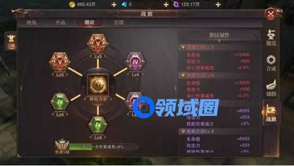 通过镶嵌不同的战旗雕纹可以获得不同的属性加成,其中每个战旗均有两个初级雕纹孔、中级雕纹孔和高级雕纹