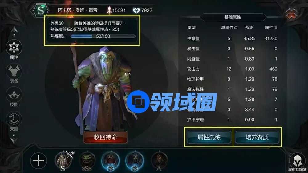 提升雇佣兵属性有三个途径:等级与熟练度,额外属性点,资质提升。