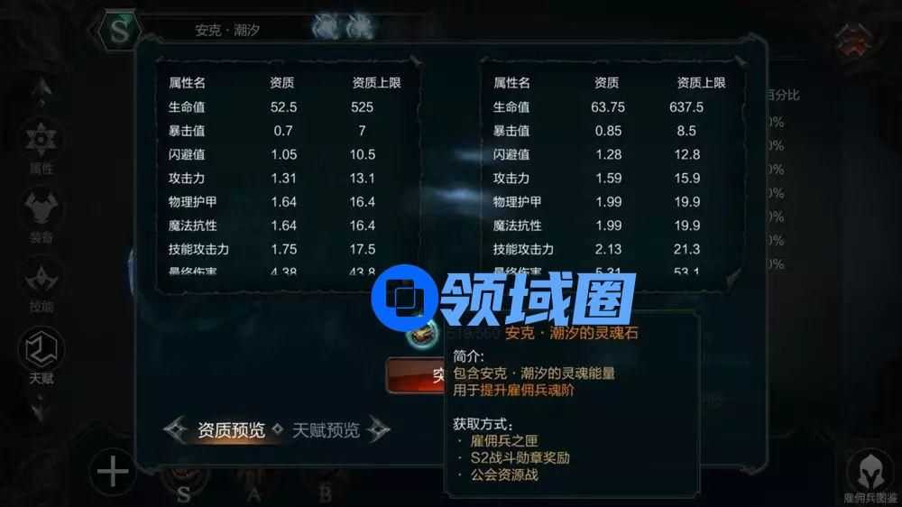 雇佣兵天赋突破和英雄提升魂阶一样,也是需要相应的灵魂石。天赋突破不仅能提升资质和天赋属性,还可以提升雇佣兵的品质,最终达到SSS。