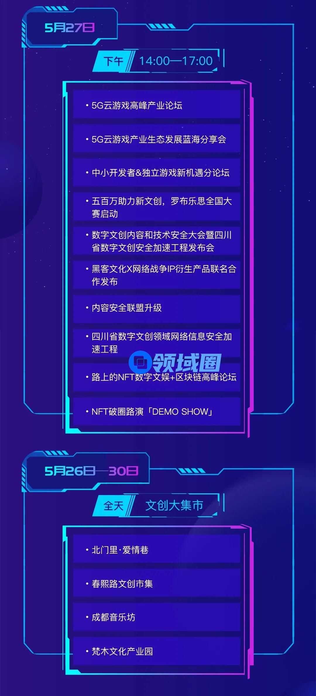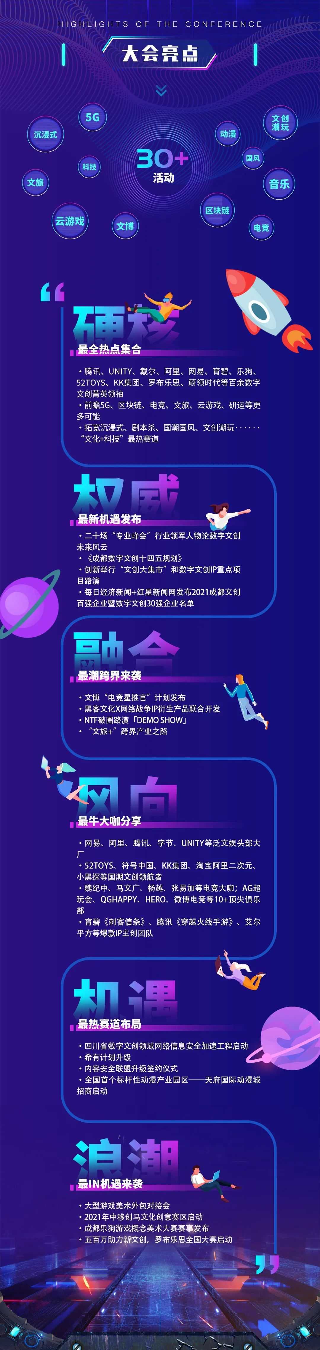 5月26日至27日,大会邀请腾讯、网易、阿里、全球电竞联合会、联通、52toys、罗布乐思等数百家数字文创行业龙头企业,涵盖文旅、音乐、AI、动漫、电竞、潮玩、数字视觉艺术、游戏开发、网络安全等行业前沿领域在天府国际会议中心共同参与,以产业峰会、高峰主体论坛等形式,邀请国内外行业领军人物、企业共同探讨产业数字文创的国际化、多元化发展策略。同时分享国际前沿资讯与技术,搭建一个开放、中立、活跃的国际化合作交流平台,加快数字文创与相关产业多向深度融合。