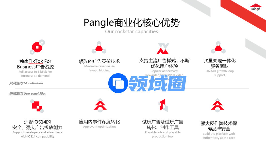 在用户增长阶段,Pangle可以通过多种广告样式,助力游戏精准触达潜在用户,应用内事件按优化还可助力提升流量转化,还有定制化、精细化运营服务一站式解决开发者的获量难题;在变现阶段,Pangle可向游戏开发者提供TikTok For Business独家广告主资源,创新的广告样式与先进的应用内竞价技术可以有效提高广告点击,提升开发者收益。