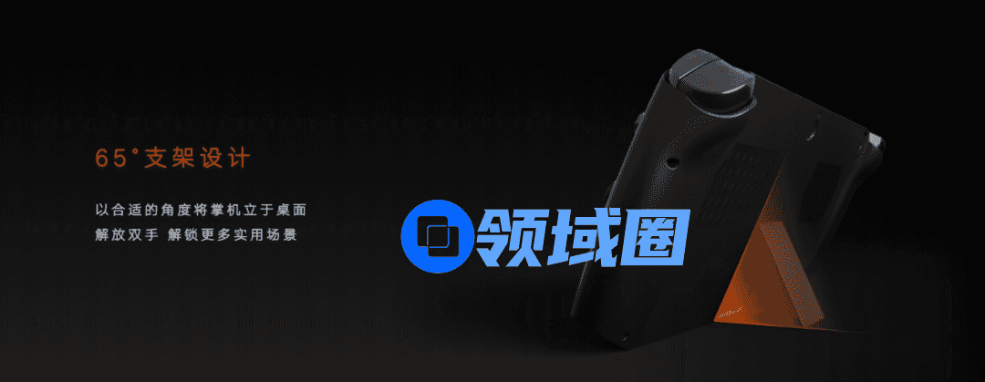 OnexPlayer背部出于人体工程学的设计,手柄的握持位置有明显的凸起,很好的照顾到了背部两个超大进风口。中间配备了一个指纹识别按钮,背部两侧则是调节音量的三个按键。背部靠下的位置有一个隐藏支架,全部张开大约有65°左右。