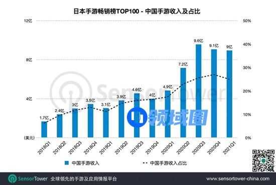 中国游戏Q1在日本表现亦有明显进步。Q1中国游戏在Top 100中占9款,共计收入9亿美元占比25%。而去年Q1中国手游在Top 100中占比约20%左右。