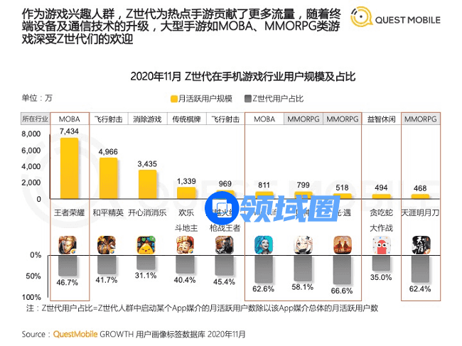 根据Questmobile报告显示,过去5年Z世代移动互联网用户规模持续快速增长,截止2020年11月已达3.2亿规模。作为互联网原生一代,Z世代逐渐成为手游的生力军。通过调研数据来看,当下市场上流行的MOBA、MMORPG等产品中,Z世代用户的占比持续扩大。