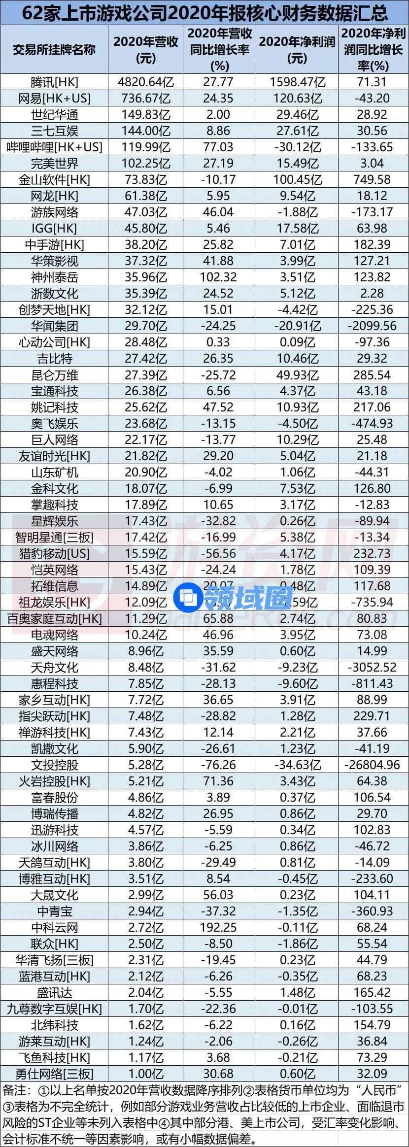 日前,各大上市游戏公司2020年年度报告,以及部分公司的2021年一季度财报已披露完毕。据GameRes不完全统计,梳理出了涵盖A股(含新三板)、美股、港股的62家游戏上市公司2020年年报数据,以及A股上市公司的一季报数据,旨在为行业提供一定参考价值。