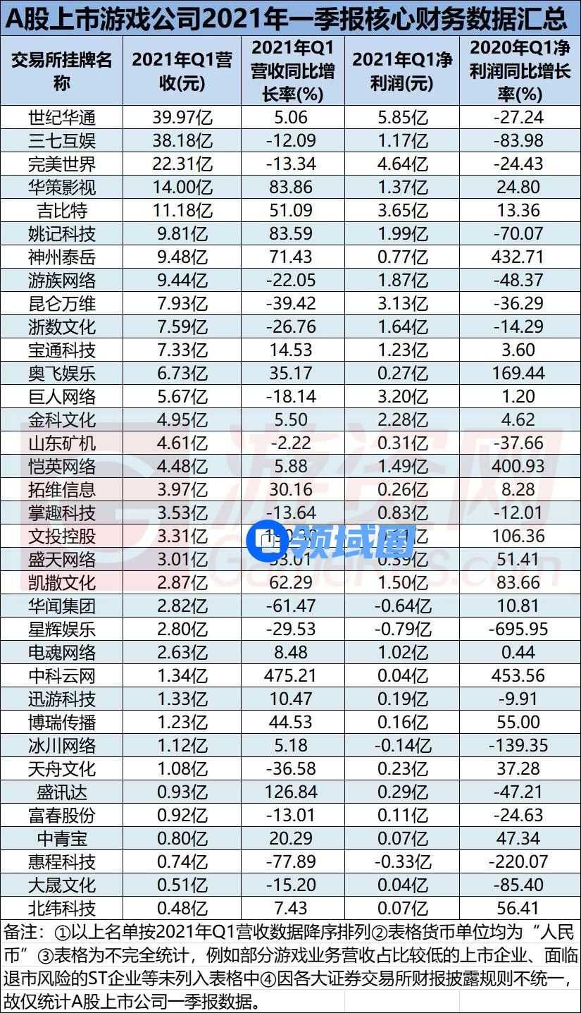 35家A股游戏公司一季报数据汇总