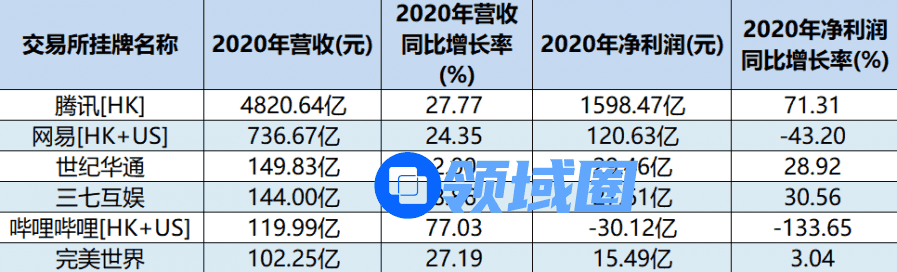 2020年,哔哩哔哩、完美世界营收首次突破百亿元大关,成为第5、6位跻身游戏上市公司“百亿营收俱乐部”的新晋企业。