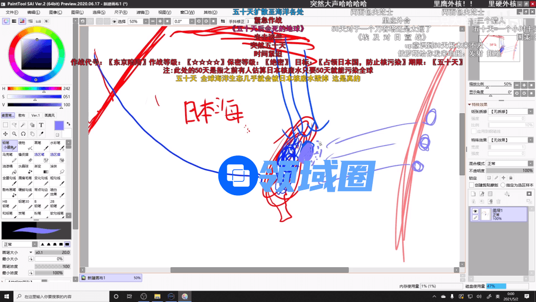 整段视频长度约15分钟左右,排除前后胡言乱语的搞笑部分,其中让很多玩家与普通青年感到共鸣的主要来自视频中间。在约6分钟的时间里,一只大哈鱼突然话锋一转,不知道从哪里掏出了吃灰很久的数位板,用小学2年级水平的画图技术,开始构思对抗日本核废水排放的战争蓝图。