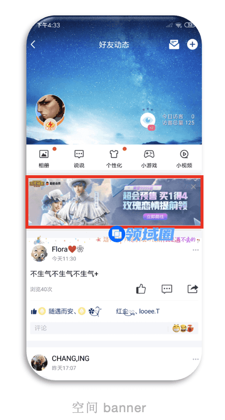空间海量曝光:而在QQ空间场景下,挂件气泡、结合版banner等创意形态均可搭载,触点多元、曝光力强。
