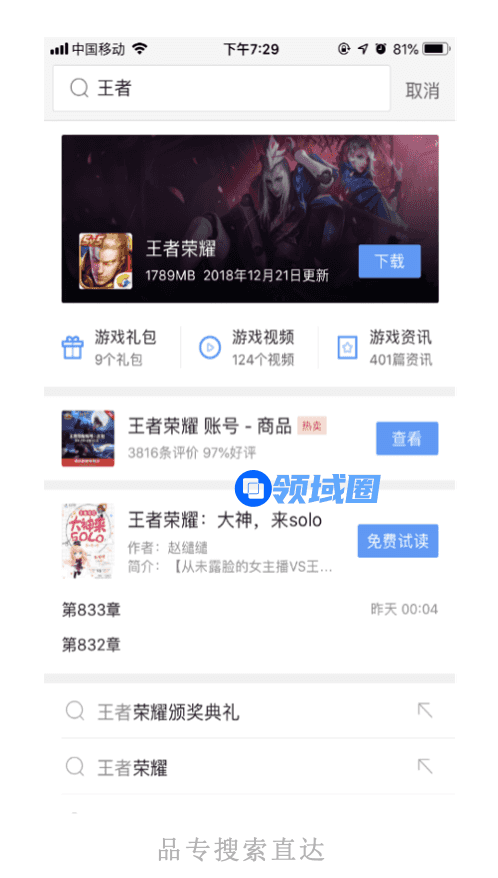 腾讯广告精准搜索资源将在用户输入品牌词或品牌关联词时,以创意动态图像+链接的形式展示品牌,有效将用户此时的信息需求与游戏品牌相关联,在扩大游戏推广范围的同时,增加用户基数的触达与心智影响。同时,链接形式更可直接引流,品牌曝光与心智转化高效完成。