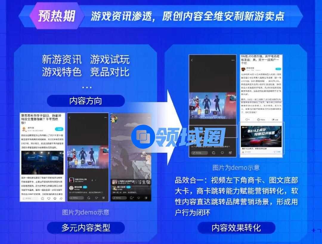 在预热期,围绕新游针对性匹配资讯、试玩、竞品比对等内容,通过多元内容类型吸引玩家注意力,在心智层面植入兴趣。而通过视频左下角商卡、图文底部大卡等,更可让效与品协同随行,形成新游宣发闭环。