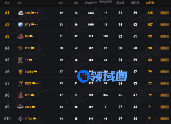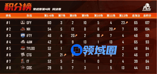 周中赛的战斗同样激烈,明星战队4AM在周中赛中展现了令人恐惧的强悍实力。89个淘汰和1232的场均输出让他们所向披靡,拿到120个周中赛积分夺得头魁,以凯旋之姿挺进周决赛,同时Xiaohaixxxx和CRAZY112还分别拿下击杀之最和输出之最两个头衔。位列第二的iFTY战队同样实力不俗,队内小9扛起大旗,一人拿下25个淘汰数激起全队汹涌斗志,一鼓作气拿下107分冲入周决赛。NH战队则保持一贯风范,状态火热的他们在战斗中从容不迫,凭借着稳定的发挥连连拿分,以93分拿下第三跻身周决赛。COC、17两支战队依旧出彩,分别以90、83分位列四、五名拿到周决赛门票进入下一轮的比拼。