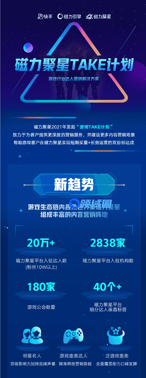 在存量竞争时代,快手做到了为用户客户扩大品牌声量,降低获客成本,沉淀长效营销价值,吸引了越来越多游戏大厂将快手作为宣发渠道。而快手能够做到这一切的关键,在于快手磁力聚星“游戏Take计划”在游戏生态下的“三板斧”。