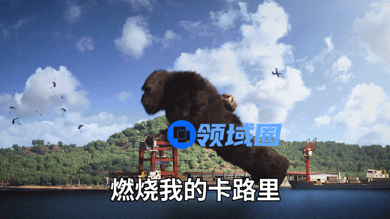 出生岛的坏飞机终于有了人来合理的交代了起源,原来是哥斯拉喷毁的;在电影中肩膀脱臼的金刚,在《和平精英》的游戏世界里喝下能量饮料,变身健身达人精神奕奕;康复后的金刚对着海的另一边比出了贯穿电影的灵魂手势“home”,让电影粉丝对游戏有了共情感。