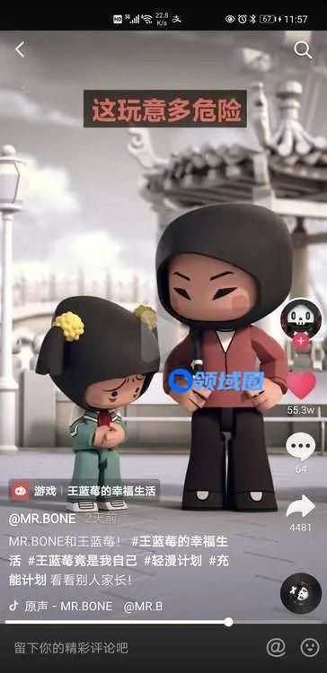 意外的是,在「王蓝莓竟是我自己」话题下点赞量最高的视频不是王蓝莓、不是明星或其他Kol的视频,而是轻漫计划达人MR.BONE的动画作品。Ohayoo的多圈层营销还是有其先见之明的,不仅靠童年怀旧这一简单质朴的情感触及目标群体,同时也靠一些另类的手法带来更多的玩家。