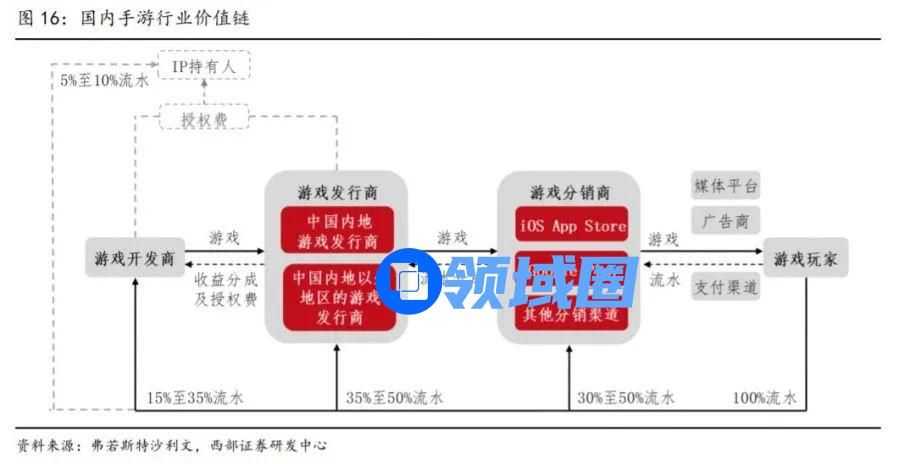 渠道商:目前分销商的分成比例在30%-50%之间,如苹果应用商店抽成比例为30%,国内安卓最高为50%,但TapTap为零分成。渠道商参与流水分成后,剩下的利润在开发商和发行商之间分配。