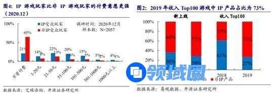 根据开源证券,IP游戏的玩家的付费意愿更强烈,同时,玩家也会受IP吸引而选择游戏。目前的游戏市场来看,预计2021年IP游戏市场规模能达到近1700亿元,IP游戏占整个中国手游市场的比例2020年超70%,根据2019年收入前100位的游戏中IP游戏的占比也可以得出这一结论。