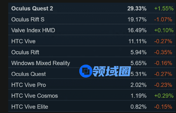 与Oculus Quest 2相比,几款其他主流头显的市场占有率出现了不同程度的下滑。例如,Oculus Rift S(现已停产)的市场占比减少了1.07%,Oculus Quest市占率下降0.27%,而Vive系列头显的市场占比也从4月份的15.50%下滑到了15.14%。