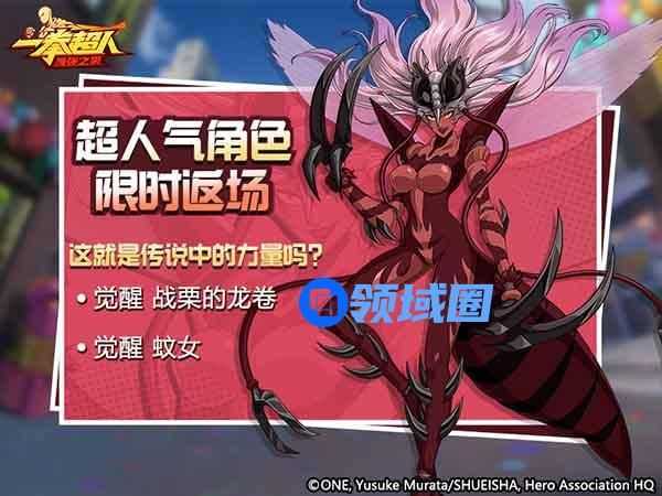 超强单体、连续追击的【觉醒】蚊女和强力压制、持续回复的【觉醒】战栗龙卷,凭借绝美的外表以及超强实力,可谓是《一拳超人:最强之男》中人气最旺的两大角色。在两周年庆典之间,这两大人气角色将同时返场,超高概率的UP加持,助力各位玩家终将“抱得美人归”。