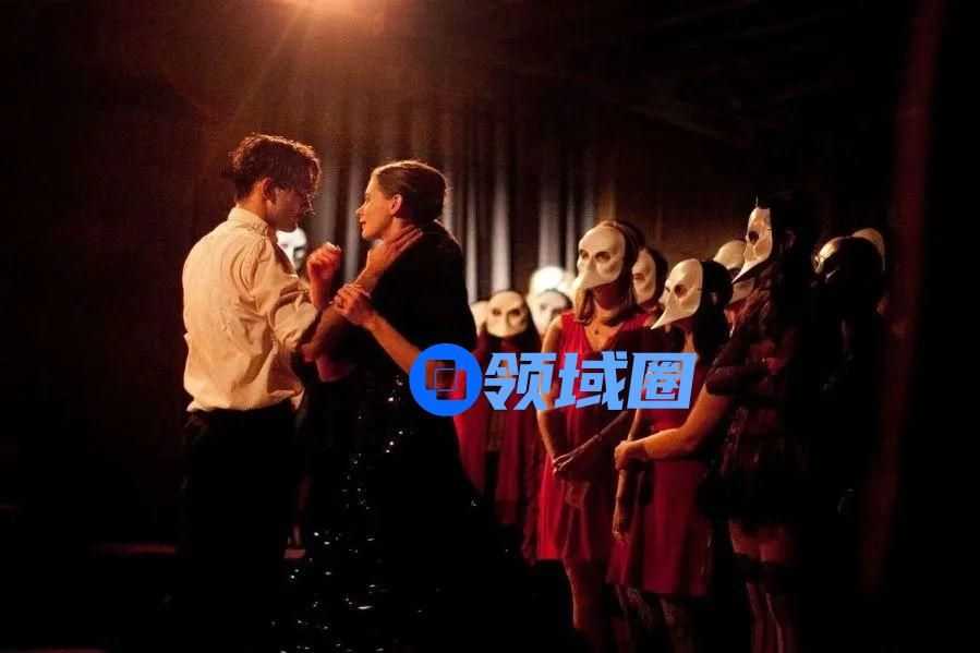 观众都带着白面具簇拥在演员一臂之遥的位置