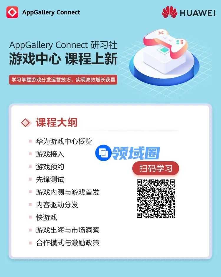 华为应用市场AppGallery Connect研习社(简称AGC研习社)正式上线《华为游戏中心》系列培训课程,课程内容聚焦游戏开发者关心的热点话题,包括如何上架游戏,如何高效触达用户等,均可在课程中找到答案。扫码开始学习,快速掌握游戏发行获量的实用服务及知识,提升你的游戏分发与运营表现吧!