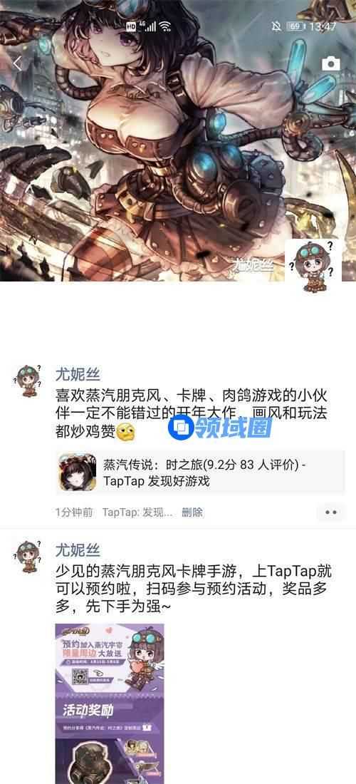 4月25日至5月8日23:59:59,TapTap关注/预约《蒸汽传说:时之旅》游戏后,将活动宣传图或本文或TapTap帖子分享到微信朋友圈、微博、QQ空间等,附上10个字以上安利的话(如下图所示):