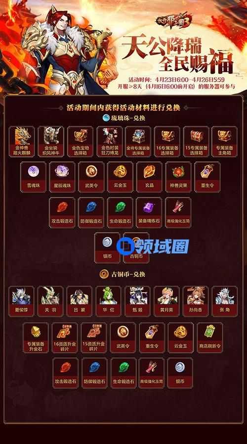 4月23日6:00-4月26日5:59期间,玩家参与活动可获得道具「古铜币」、「琉璃珠」。每日挂机可产出大量「古铜币」,可用于兑换专属装备升金石、15/16资质三国名将等珍贵资源。「琉璃珠」可用于兑换人气时装-狂刀缚龙、炫酷坐骑-炽风神牛及强力神兽-踏火麒麟等拥有炫酷外观、能全方位大幅提升属性的稀有道具,让你身披精甲,左有宝马良驹,右有神兽护佑,畅行三国书写你的征战传说!