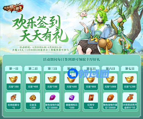 4月23日6:00-4月30日5:59期间,玩家每日登陆游戏都可领取元宝及武将培养必备稀有资源道具,累计登录七天还可领取超5000元宝、名将招募令及16资质武将升金碎片等超值福利!每天一份礼,欢乐常伴你!