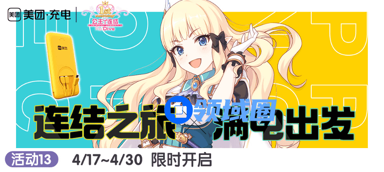 与美团充电宝的联动将在4月17日~4月30日限时开启,在上海、北京、广州、深圳、杭州五个城市租借美团充电宝,参加联动活动,则有机会通过抽奖获得公主连结限定款充电宝、随机抱枕、随机美食殿堂套头纸袋和美团优惠券等奖品。同时,公主连结限定充电机柜也会在以上城市作为彩蛋出现,留意你的身边!与咲恋一同开启满电出发的冒险之旅吧!